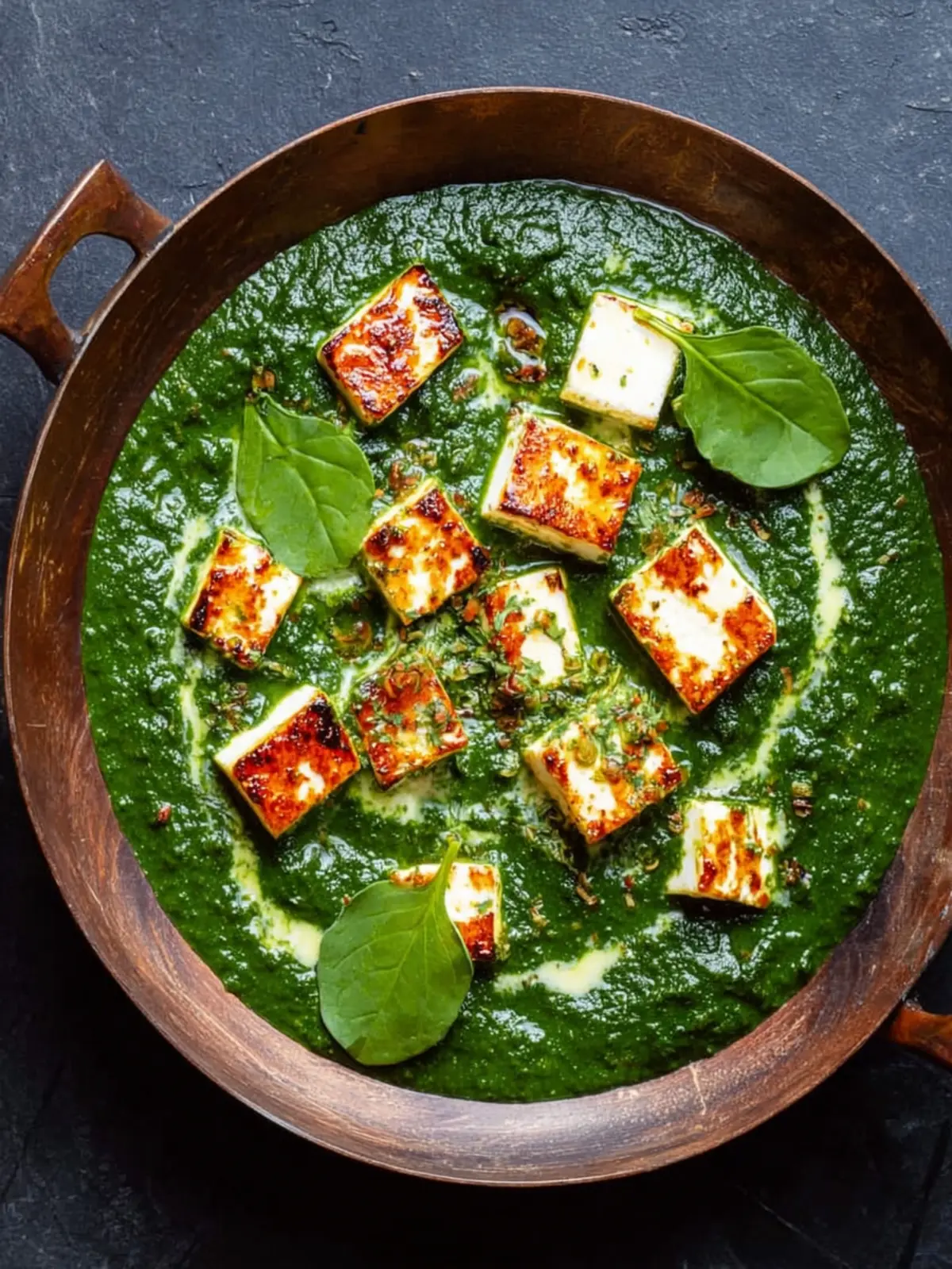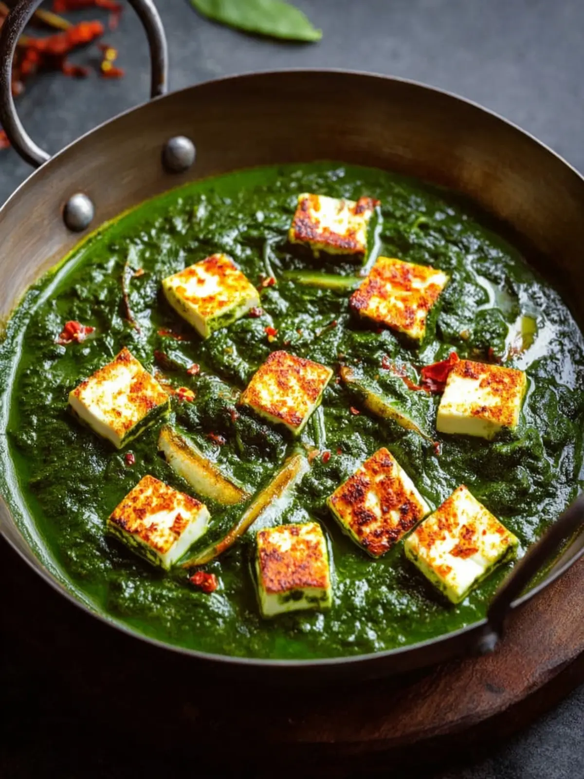A classic Indian dish made with fresh spinach and paneer, flavored with spices for a delicious meal.