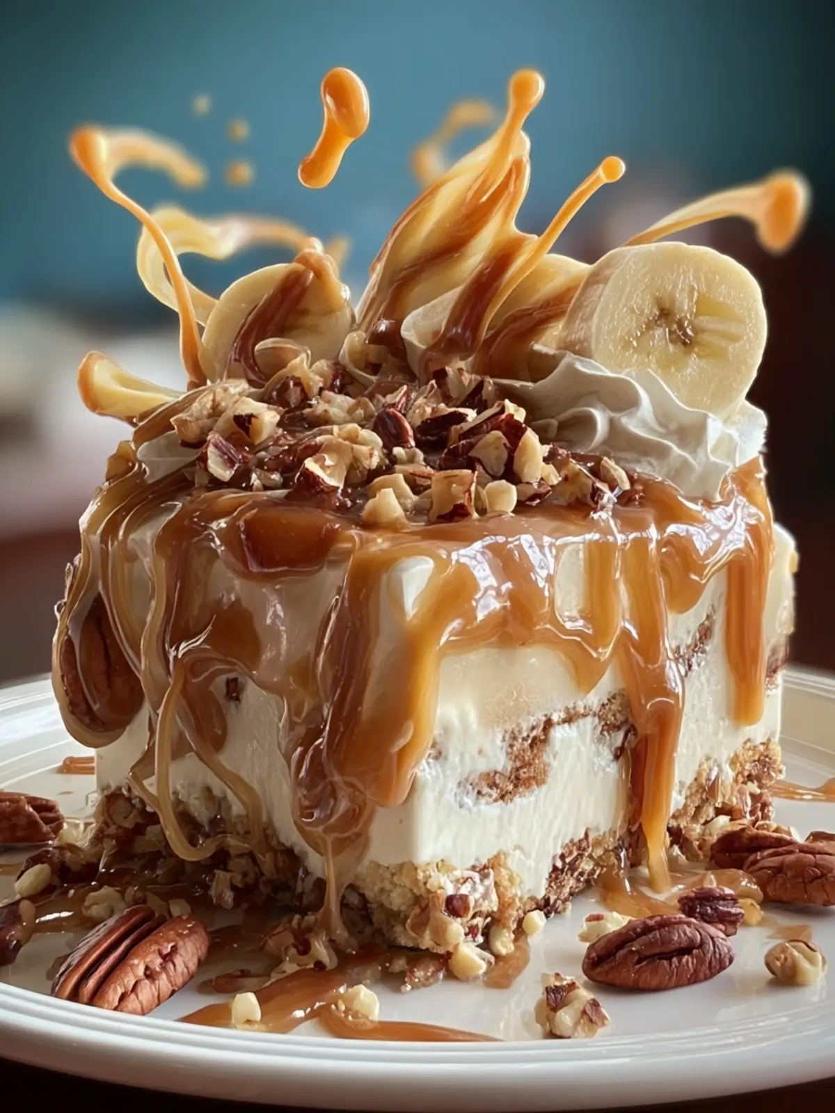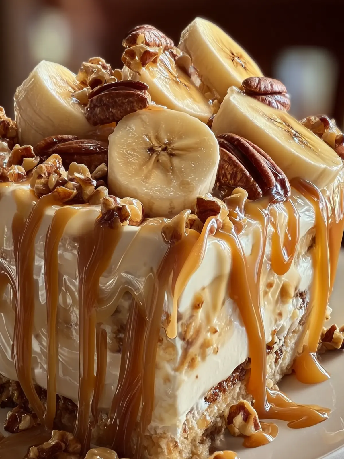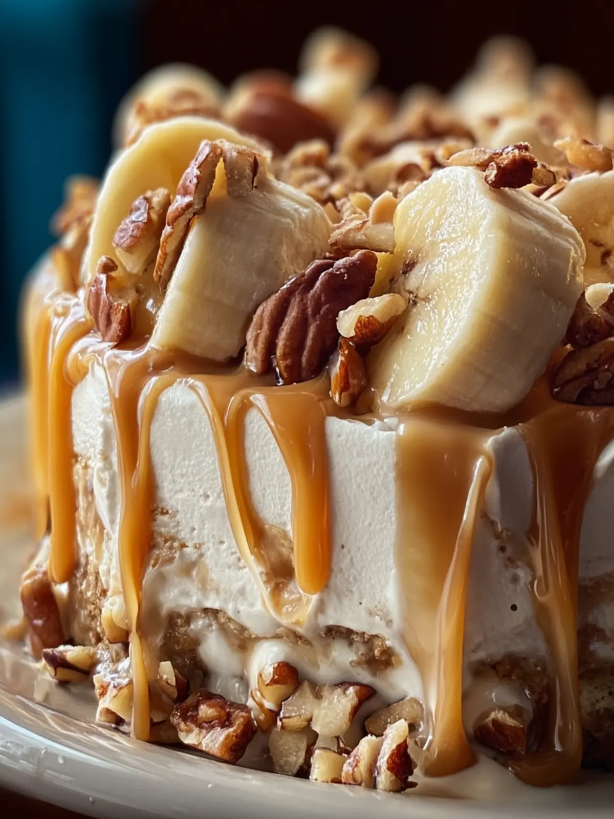 - Decorate the Cake: Remove the cake from the freezer and release it from the springform pan. Spread the whipped cream over the top of the cake. Decorate with banana slices, pecan halves, and drizzle extra caramel sauce over the top.