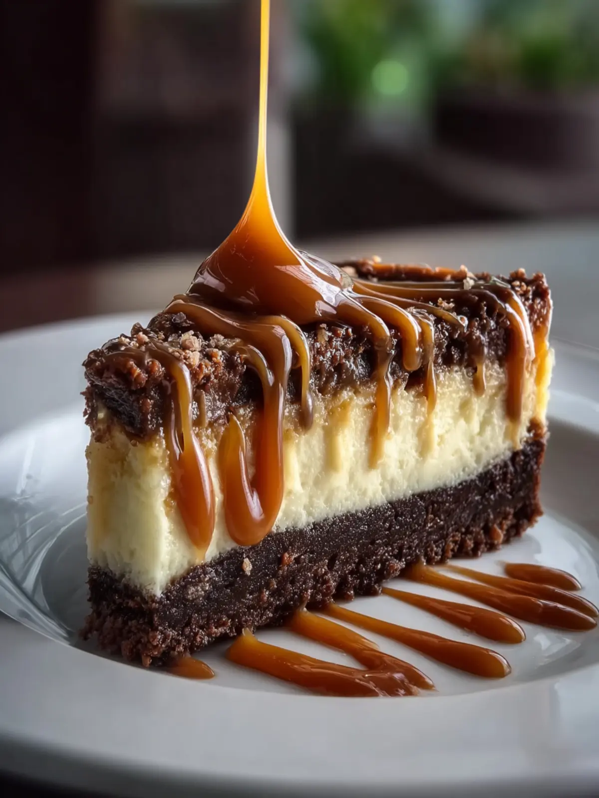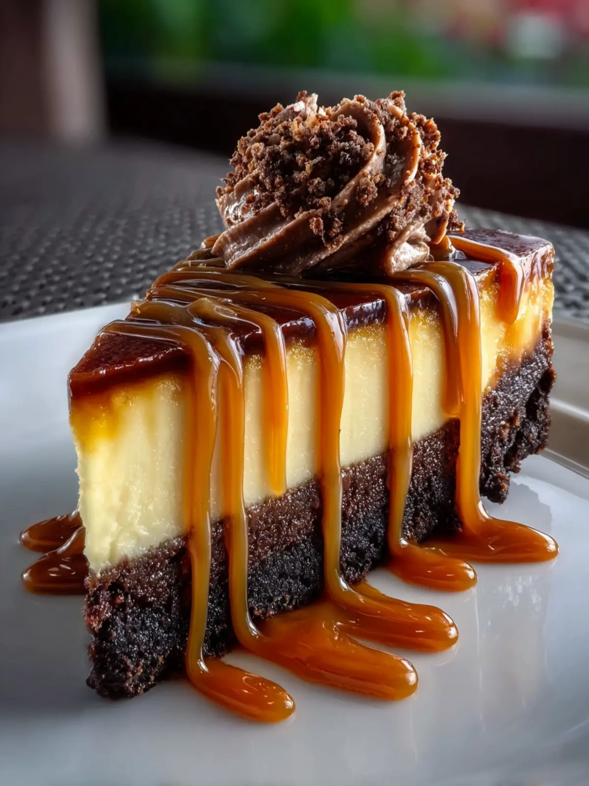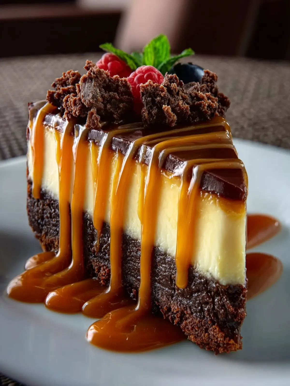 A delicious layered dessert combining rich brownies, creamy cheesecake, and a luscious caramel sauce.