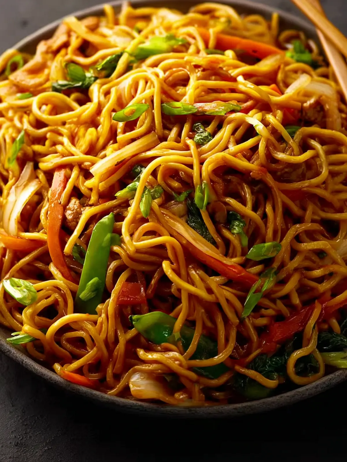 A delicious recipe for lo mein noodles stir-fried with vibrant vegetables and chicken, topped with a savory sauce.