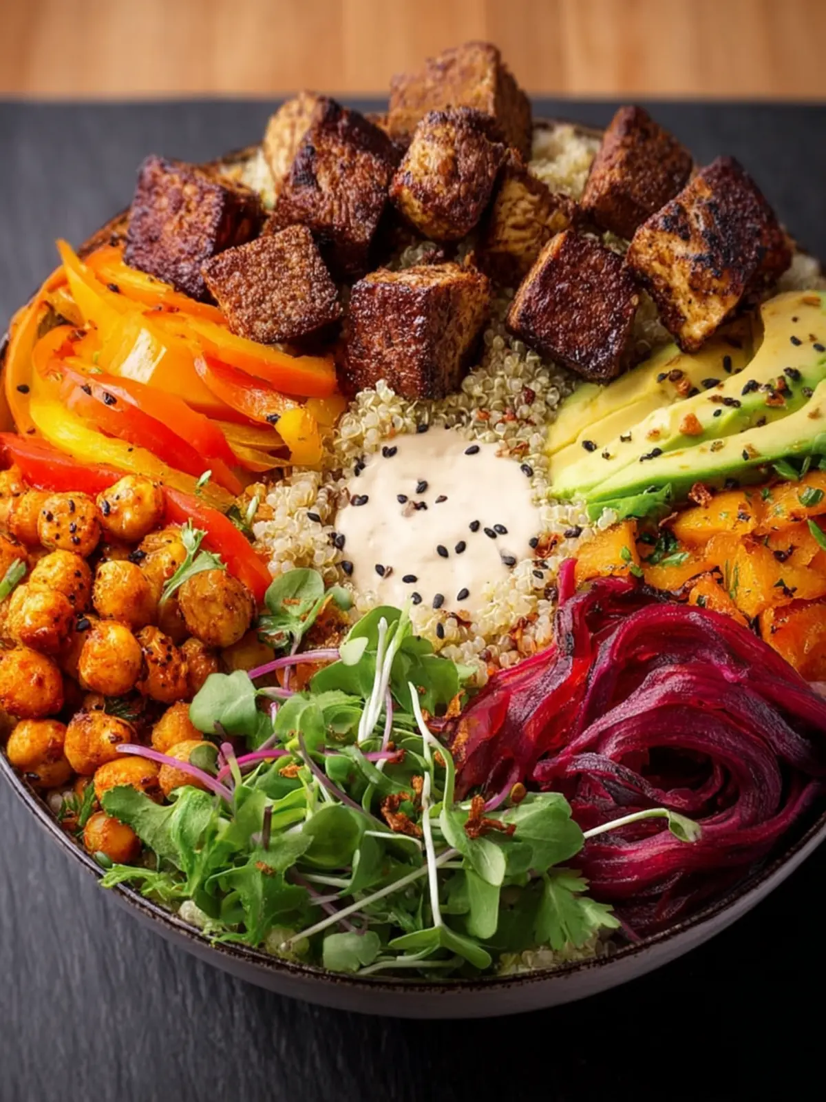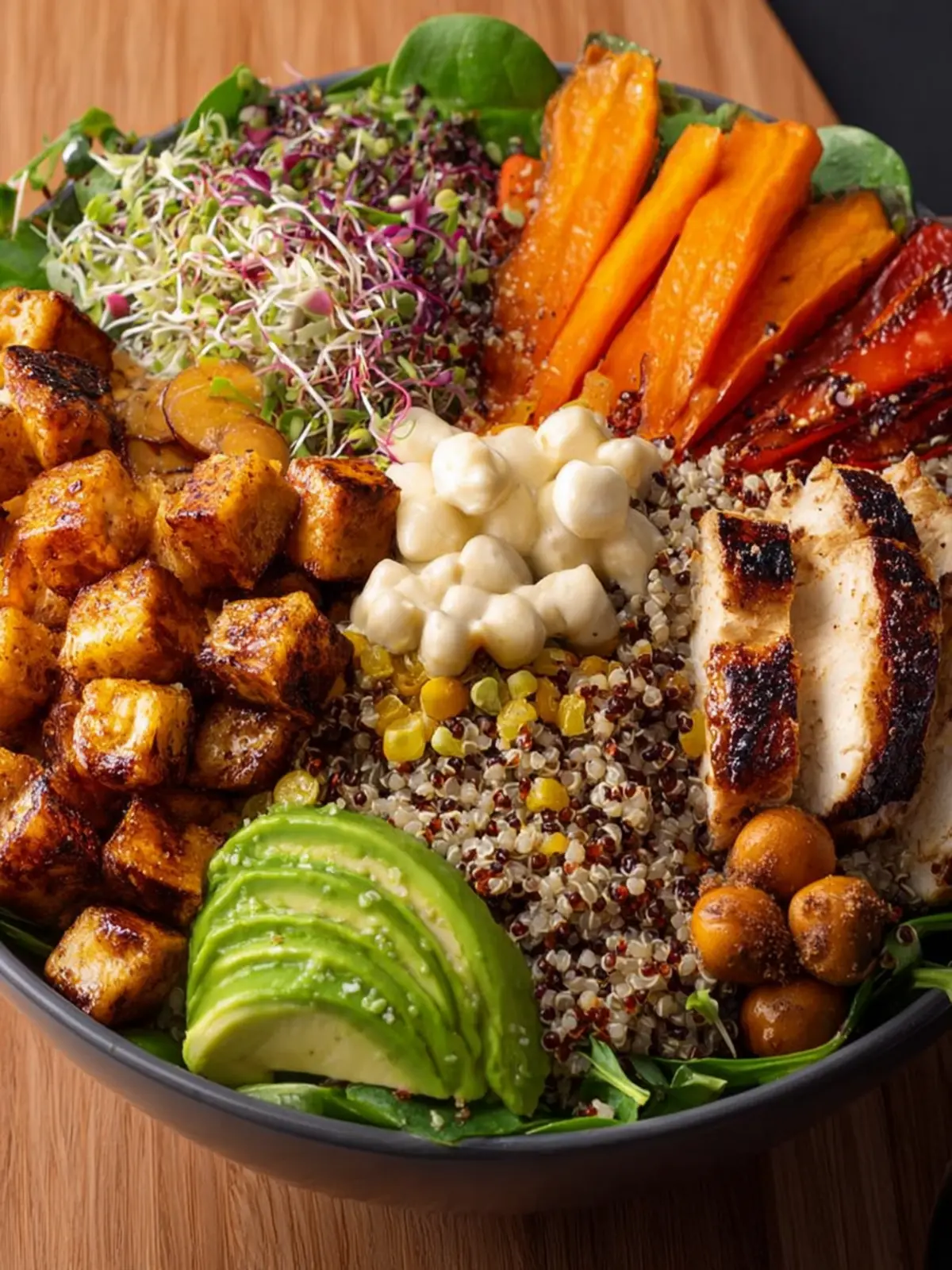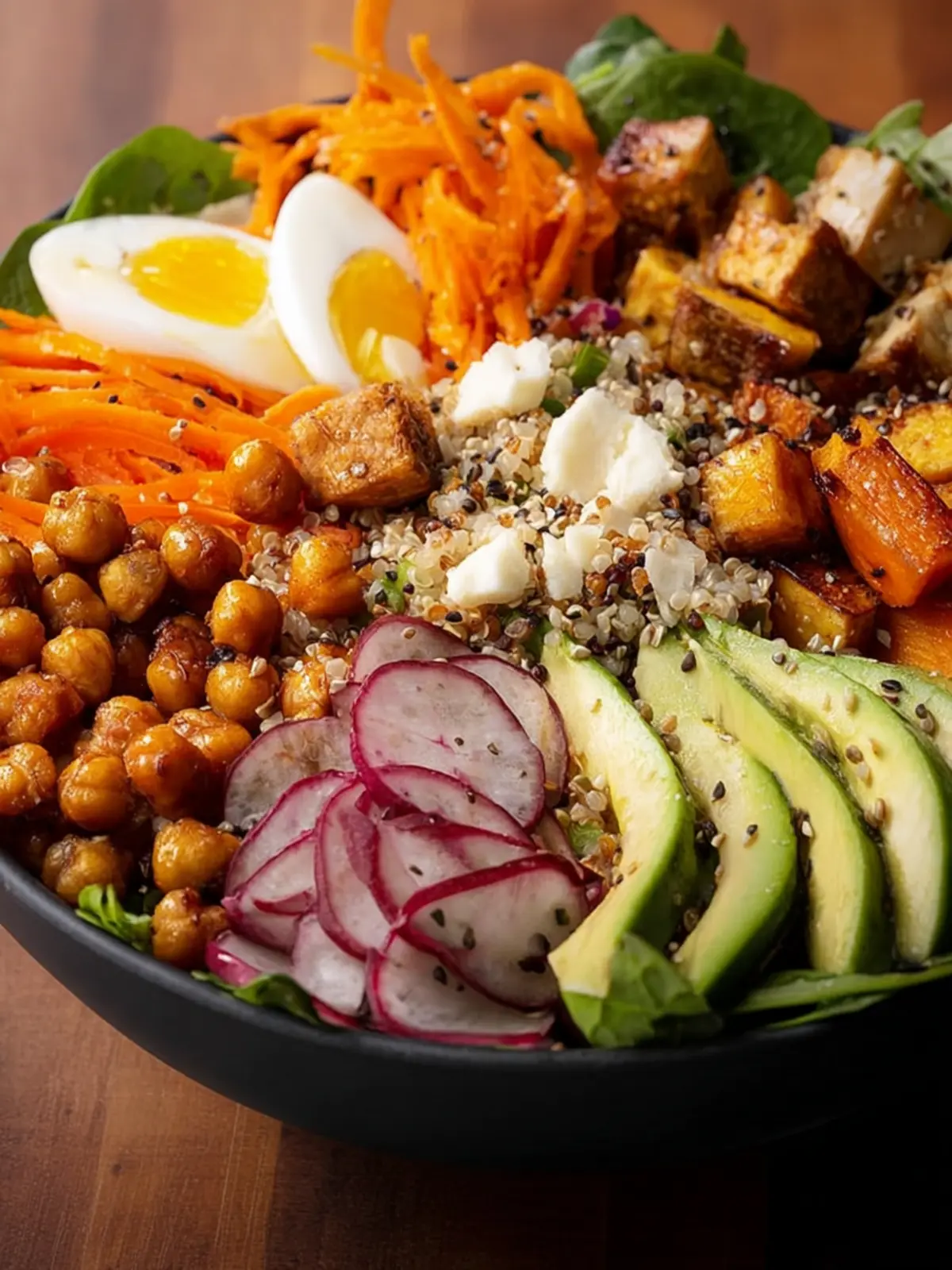 Avocado: Creamy avocado is a must-have addition! Packed with healthy fats, it brings a luscious texture that balances out the crunch of roasted chickpeas and the firmness of tofu.