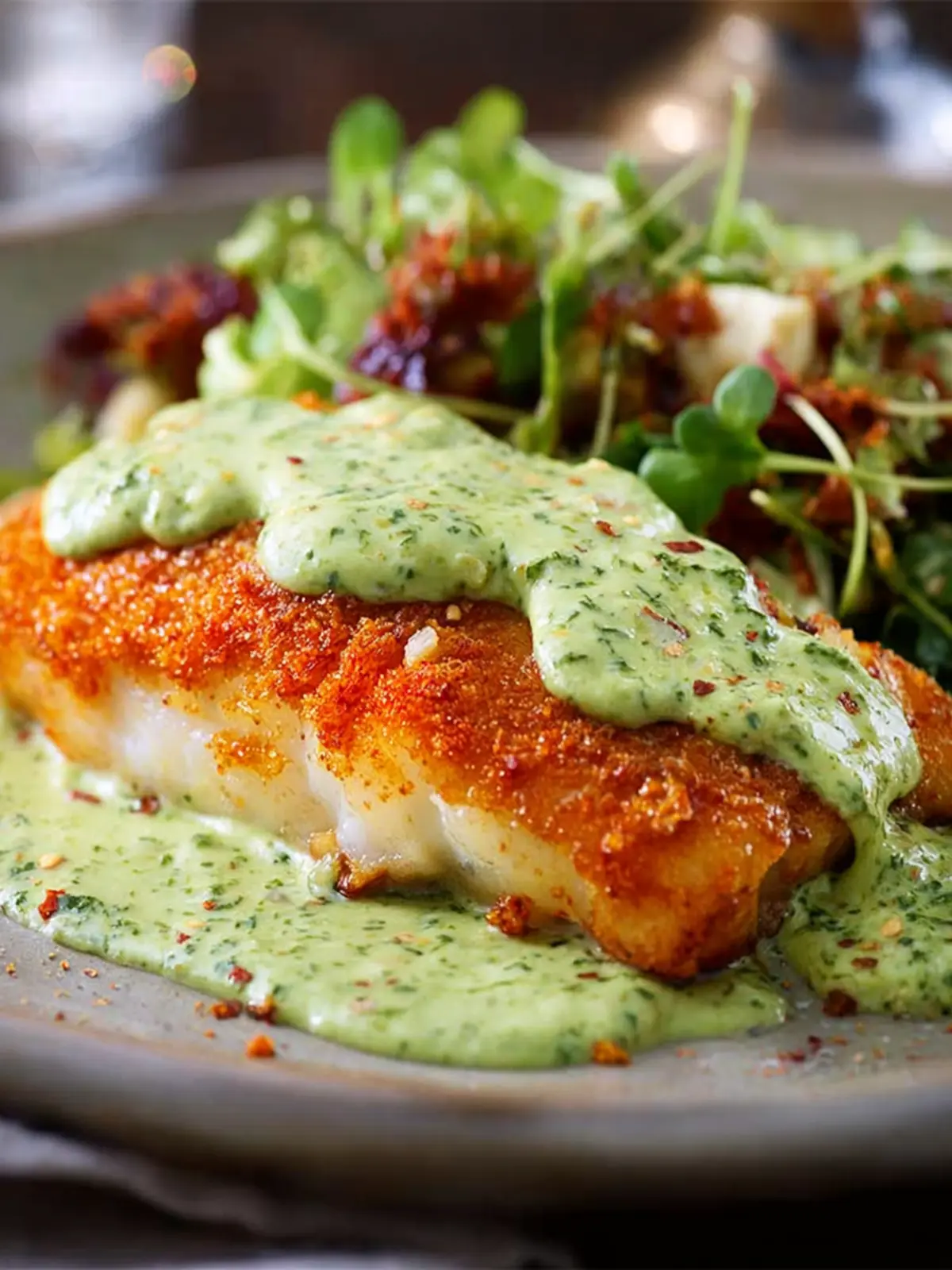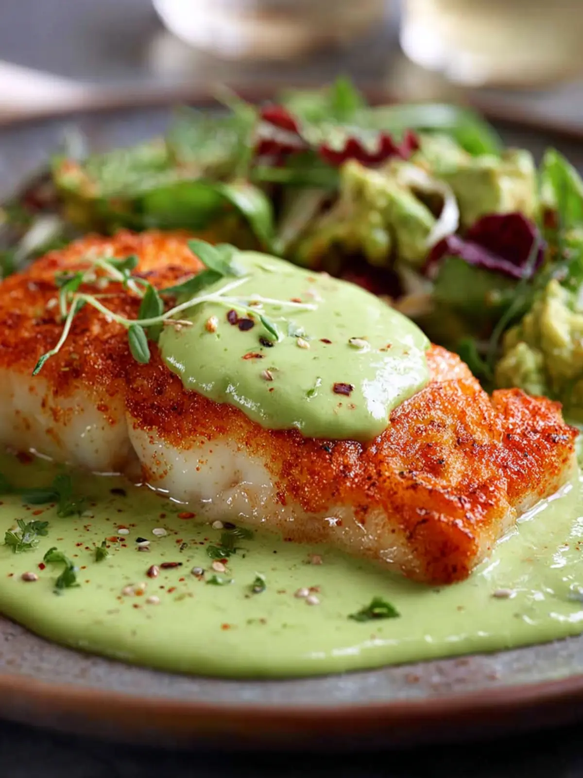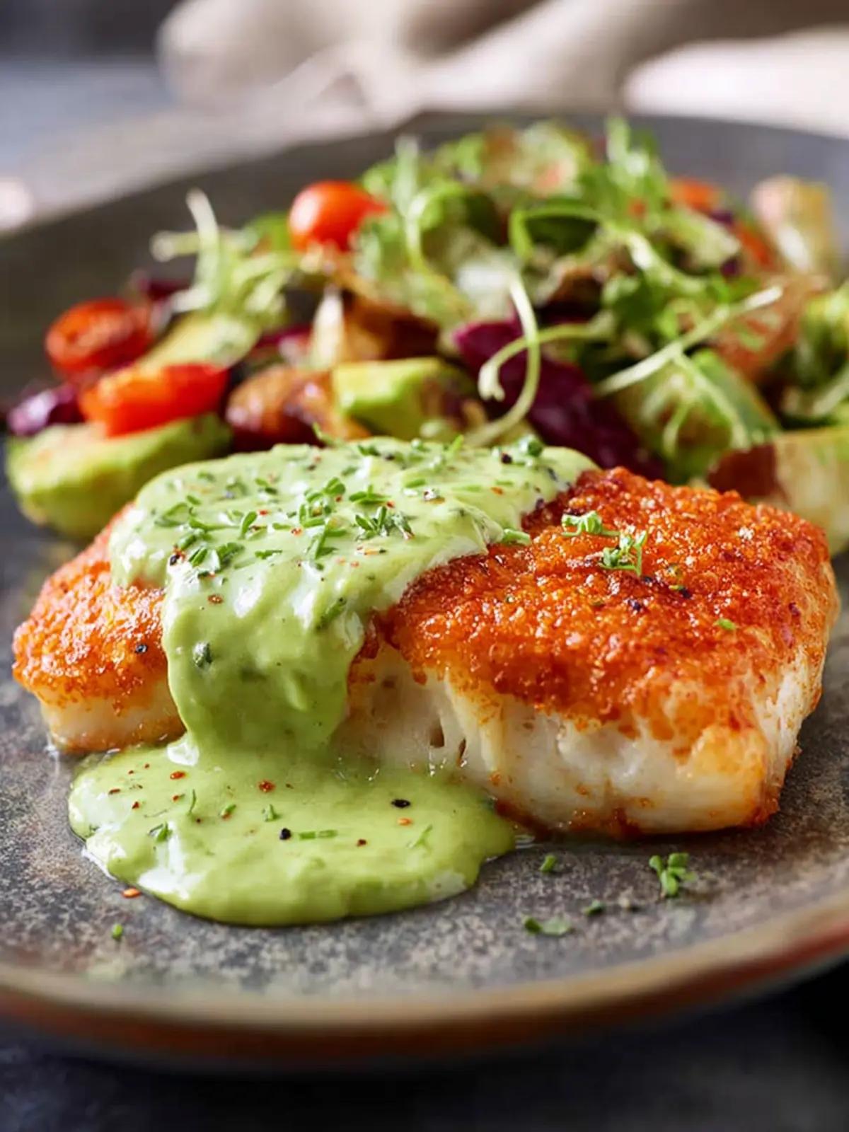 This crispy cod recipe features a delightful avocado cream sauce that enhances the flavor of the fish.