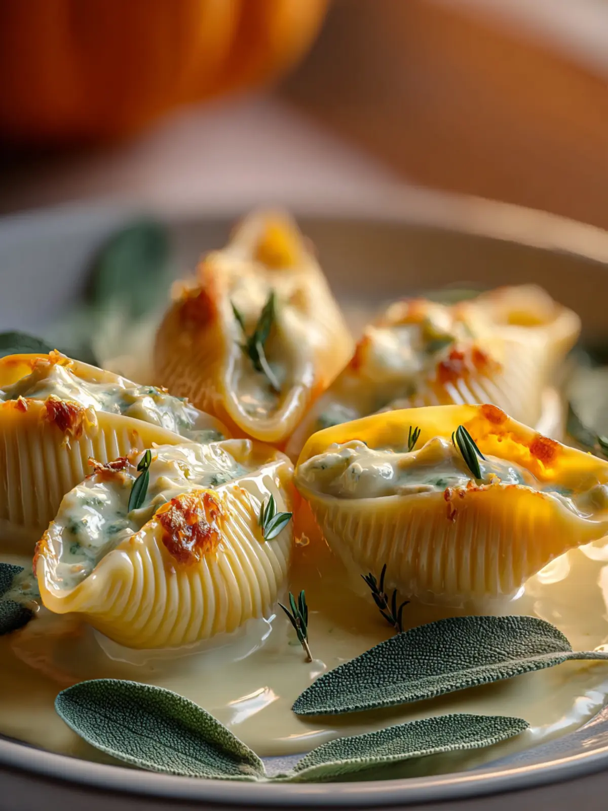 A delicious dish of jumbo pasta shells stuffed with a creamy pumpkin and cheese filling, topped with brown butter sage sauce.