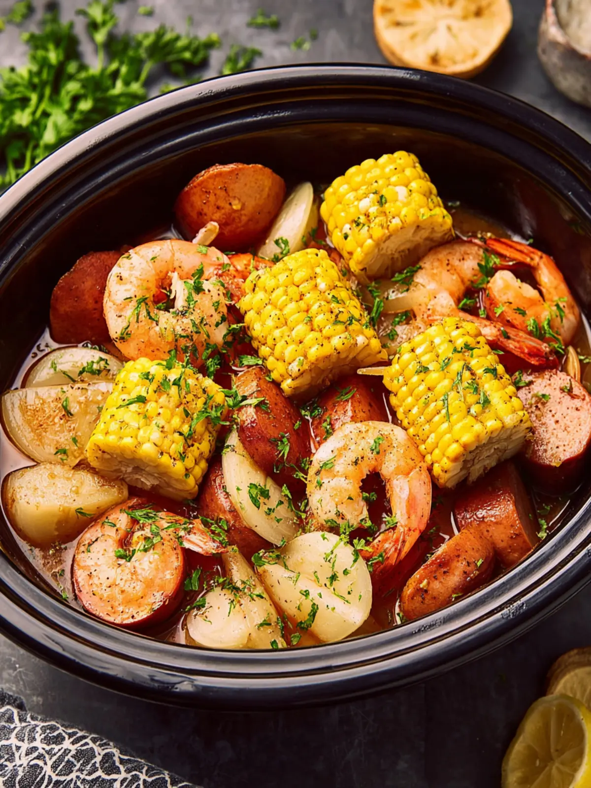A delicious and easy crockpot shrimp boil featuring red-skinned potatoes, andouille sausage, sweet corn, and jumbo shrimp, seasoned to perfection.