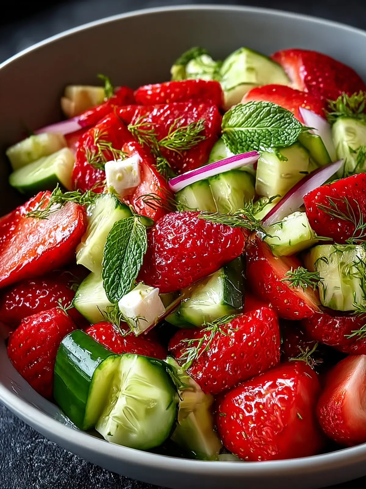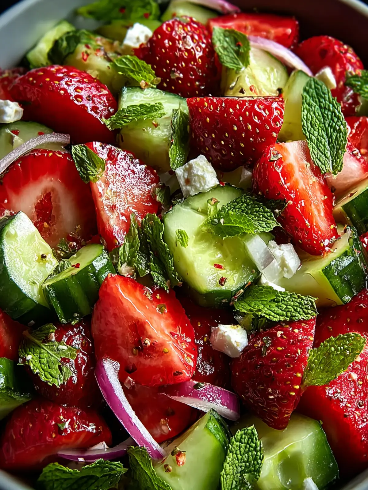 Yes, you can prepare certain components ahead of time! Slice your cucumbers and strawberries a few hours before serving and keep them in separate containers. However, for the best flavor and texture, it’s best to mix the salad just before serving to keep the cucumbers crisp and the strawberries fresh.